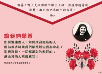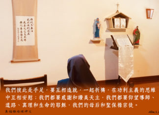 「天主給予我們聖召的同時,也賜給我們完成它的恩寵。」的確,當天主與我建立盟約時,祂已準備好一切,好使我能與祂一起走到終點,因為祂是信守盟約的天主。祂以無比的愛,藉著團體中姊妹們的信任、鼓勵、祈禱、忍耐與愛,陪伴我完成每個小使命。祂還安排了許多在世上的天使,適時伸出援手,無條件地協助,使我受到不少驚喜。一切所發生的事好似從永遠已安排好,天主的計劃在這卑微的我身上逐漸地進行。深信這是天主慈愛的手臂,將我的生命擁抱在祂的懷抱裡,每個步伐都在祂的手中。