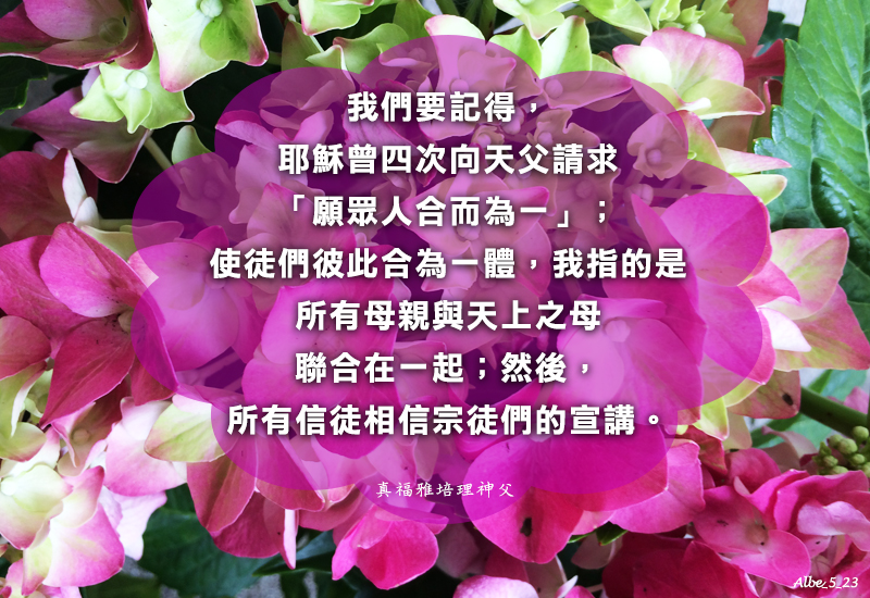 我們要記得,耶穌曾四次向天父請求「願眾人合而為一」;使徒們彼此合為一體,我指的是所有母親與天上之母聯合在一起;然後,所有信徒相信宗徒們的宣講。