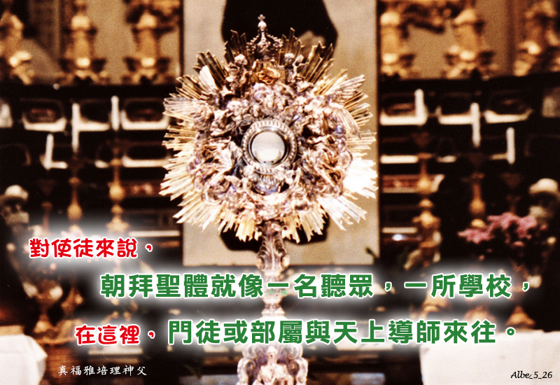朝拜聖體 24 May, 2024 分享 FacebookTwitterWhatsAppEmail列印LINE 對使徒來說,朝拜聖體就像一名聽眾,一所學校,在這裡,門徒或部屬與天上導師來往。 The visit to the Blessed Sacrament for the Apostle is like an audience, a classroom, where the disciple or minister interacts with the Divine Master (ACV, p. 103).