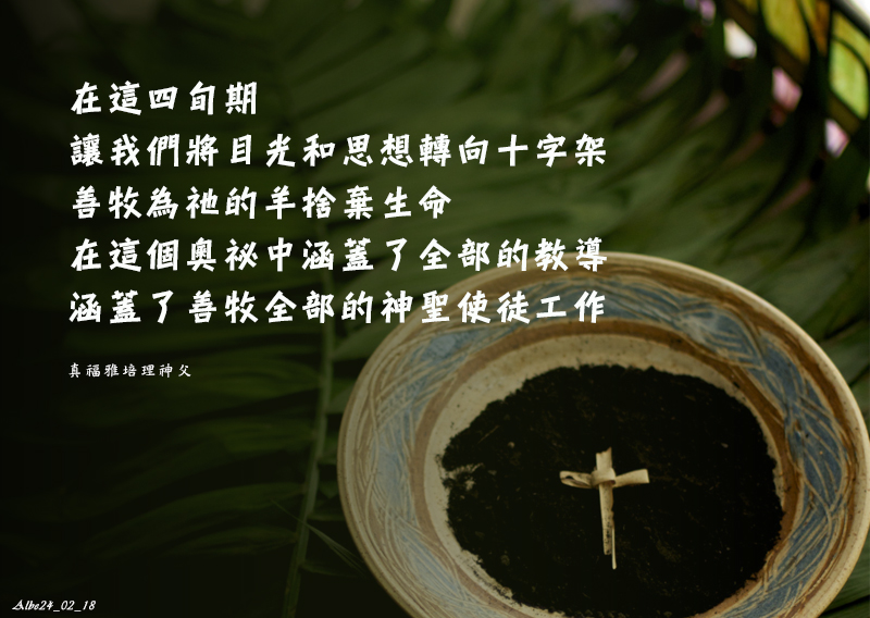 在這四旬期,讓我們將目光和思想轉向十字架。善牧為祂的羊捨棄生命,在這個奧祕中涵蓋了全部的教導,涵蓋了善牧全部的神聖使徒工作。(Pastorelle, 7, 29)