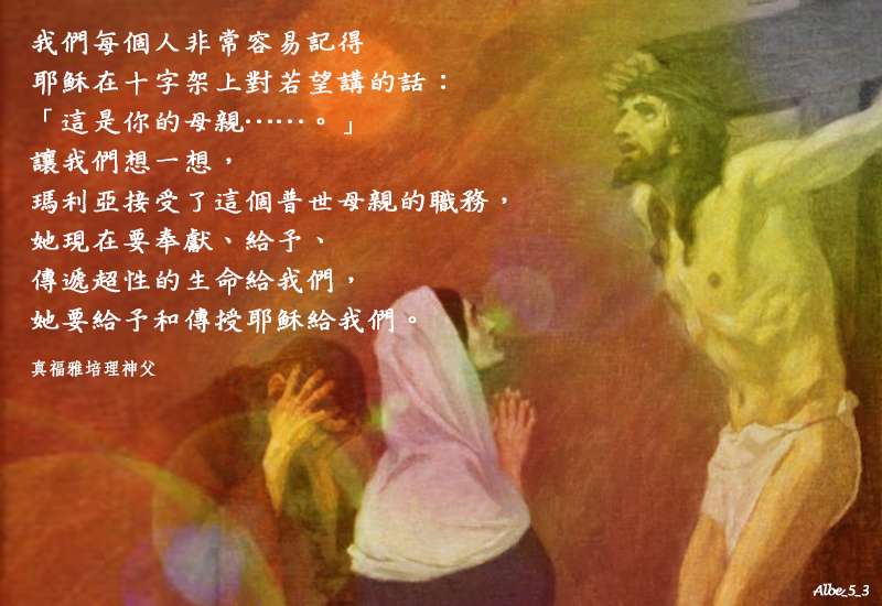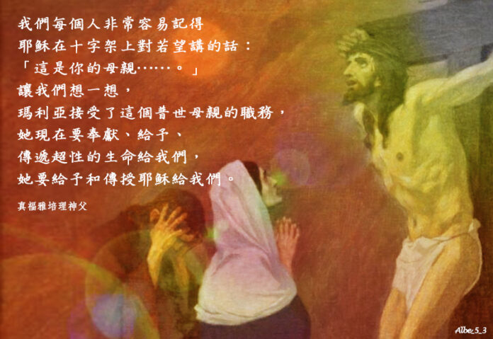 我們每個人非常容易記得耶穌在十字架上對若望講的話:「這是你的母親……。」讓我們想一想,瑪利亞接受了這個普世母親的職務,她現在要奉獻、給予、傳遞超性的生命給我們,她要給予和傳授耶穌給我們。