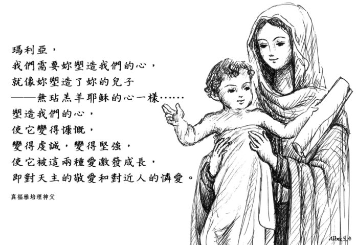 瑪利亞,我們需要妳塑造我們的心,就像妳塑造了妳的兒子——無玷羔羊耶穌的心一樣……塑造我們的心,使它變得慷慨,變得虔誠,變得堅強,使它被這兩種愛激發成長,即對天主的敬愛和對近人的憐愛。