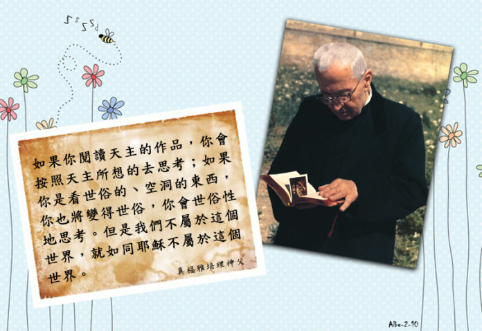 如果你閱讀天主的作品,你會按照天主所想的去思考;如果你是看世俗的、空洞的東西,你也將變得世俗,你會世俗性地思考。但是我們不屬於這個世界,就如同耶穌不屬於這個世界。