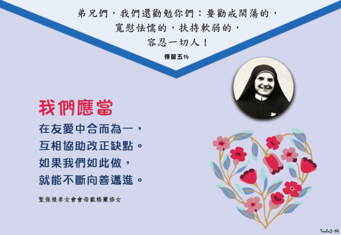 「弟兄們,我們還勸勉你們:要勸戒閑蕩的,寬慰怯懦的,扶持軟弱的,容忍一切人!」(得前五14)