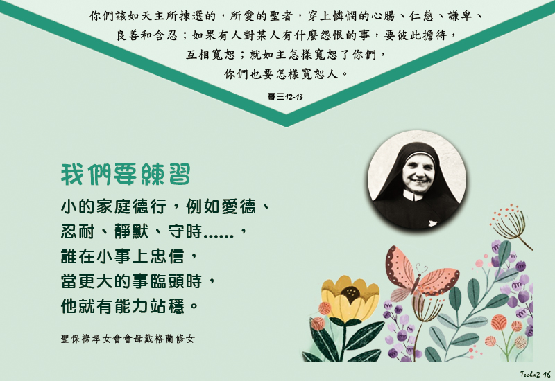 我們要練習小的家庭德行,例如愛德、忍耐、靜默、守時……,誰在小事上忠信,當更大的事臨頭時,他就有能力站穩。(VPC 162)。