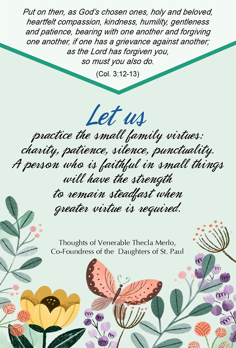 Let us practice the small family virtues: charity, patience, silence, punctuality…. A person who is faithful in small things will have the strength to remain steadfast when greater virtue is required.