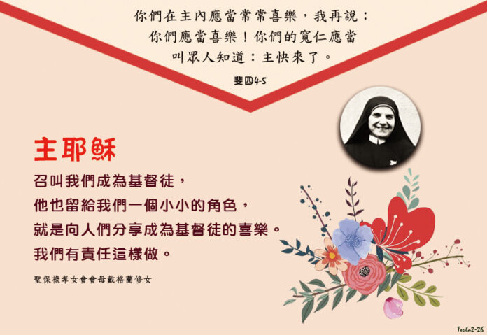 「你們在主內應當常常喜樂,我再說:你們應當喜樂!你們的寬仁應當叫眾人知道:主快來了。」(斐四4-5)