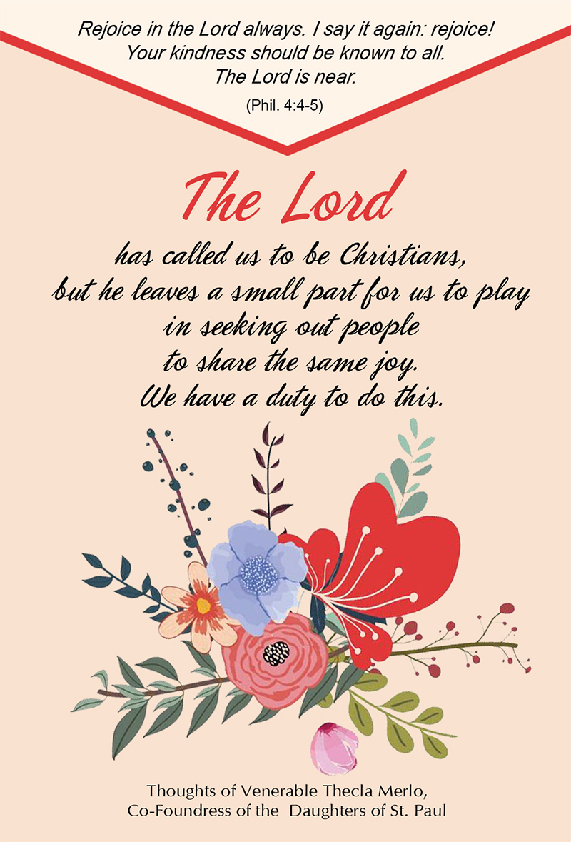 主耶穌召叫我們成為基督徒,他也留給我們一個小小的角色,就是向人們分享成為基督徒的喜樂。我們有責任這樣做。(VPC 147)