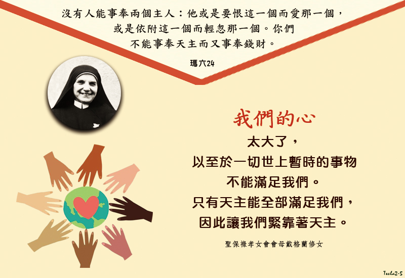 「沒有人能事奉兩個主人:他或是要恨這一個,而愛那一個,或是依附這一個,而輕忽那一個。你們不能事奉天主,而又事奉錢財。」(瑪六24)
