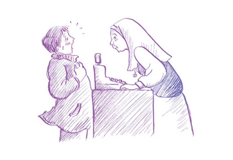 男子頓時臉色蒼白。因為他一時之間反應不過來,沒有意識到修女所說的正是藏在自己懷中的書名。只見他瞠目結舌地望著眼前這位和藹可親、年紀像自己母親的年長修女,對於那突如其來的「求親」方寸大亂,手足無措地不知該如何是好。