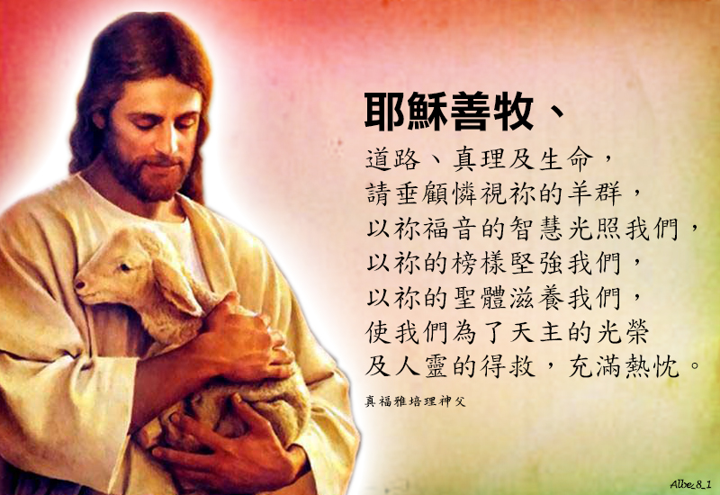 耶穌善牧、道路、真理及生命,請垂顧憐視祢的羊群,以祢福音的智慧光照我們,以祢的榜樣堅強我們,以祢的聖體滋養我們,使我們為了天主的光榮及人靈的得救,充滿熱忱。