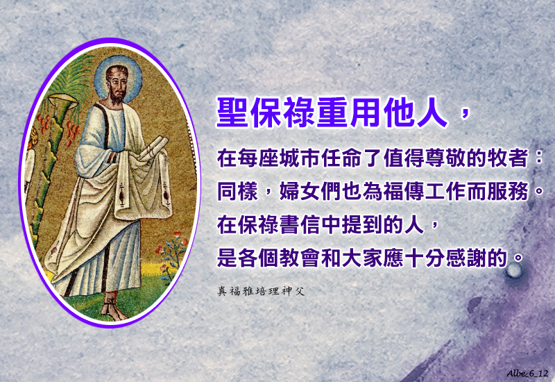 聖保祿重用他人,在每座城市任命了值得尊敬的牧者:同樣,婦女們也為福傳工作而服務。在保祿書信中提到的人,是各個教會和大家應十分感謝的。