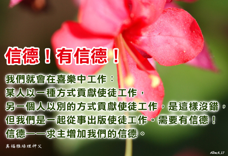 信德!有信德!我們就會在喜樂中工作:某人以一種方式貢獻使徒工作,另一個人以別的方式貢獻使徒工作,是這樣沒錯,但我們是一起從事出版使徒工作。需要有信德!信德——求主增加我們的信德。