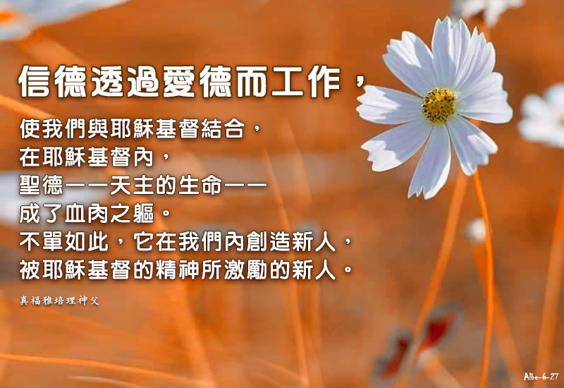 信德透過愛德而工作,使我們與耶穌基督結合,在耶穌基督內,聖德——天主的生命——成了血肉之軀。不單如此,它在我們內創造新人,被耶穌基督的精神所激勵的新人。