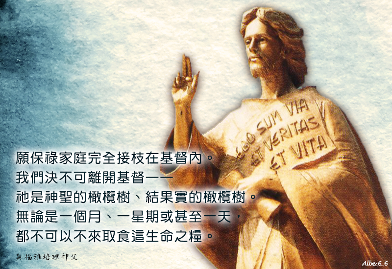 願保祿家庭完全接枝在基督內。我們決不可離開基督——祂是神聖的橄欖樹、結果實的橄欖樹。無論是一個月、一星期或甚至一天,都不可以不來取食這生命之糧。