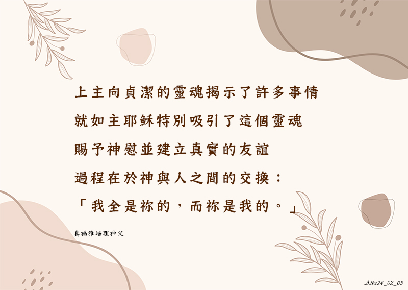 上主向貞潔的靈魂揭示了許多事情,就如主耶穌特別吸引了這個靈魂,賜予神慰並建立真實的友誼。過程在於神與人之間的交換:「我全是祢的,而祢是我的。」(APD56, 85)