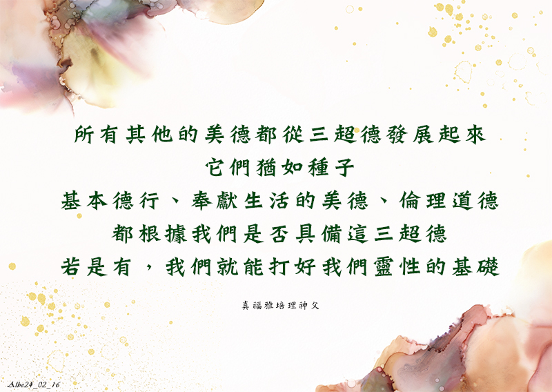 所有其他的美德都從三超德發展起來,它們猶如種子。基本德行、奉獻生活的美德、倫理道德,都根據我們是否具備這三超德。若是有,我們就能打好我們靈性的基礎。(APD56, 96)