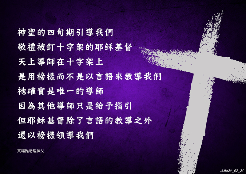 神聖的四旬期引導我們敬禮被釘十字架的耶穌基督。天上導師在十字架上,是用榜樣而不是以言語來教導我們;祂確實是唯一的導師,因為其他導師只是給予指引,但耶穌基督除了言語的教導之外,還以榜樣領導我們。(APD58, 30)