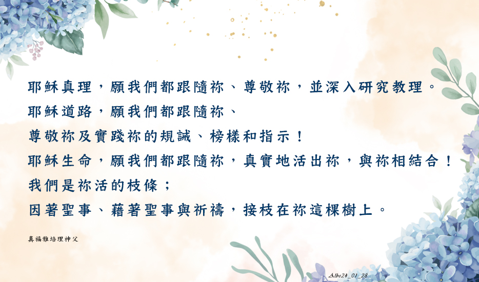 耶穌真理,願我們都跟隨祢、尊敬祢,並深入研究教理。耶穌道路,願我們都跟隨祢、尊敬祢及實踐祢的規誡、榜樣和指示!耶穌生命,願我們都跟隨祢,真實地活出祢,與祢相結合!我們是祢活的枝條;因著聖事、藉著聖事與祈禱,接枝在祢這棵樹上。(PR 132)