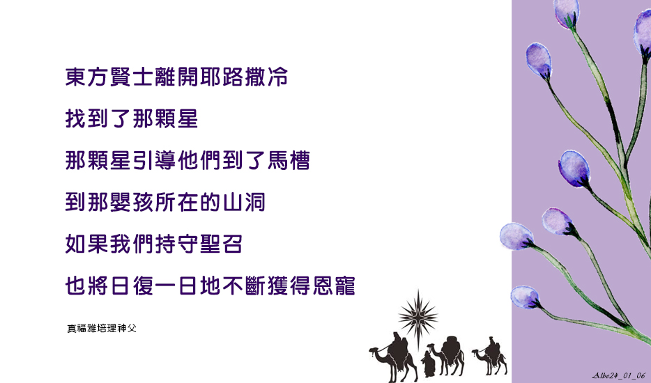 東方賢士離開耶路撒冷,找到了那顆星,那顆星引導他們到了馬槽,到那嬰孩所在的山洞。如果我們持守聖召,也將日復一日地不斷獲得恩寵。(APD56, 644)