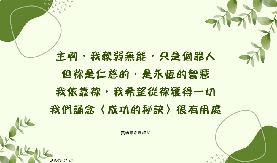主啊,我軟弱無能,只是個罪人;但祢是仁慈的,是永恆的智慧,我依靠祢,我希望從祢獲得一切。我們誦念〈成功的秘訣〉很有用處。(APD56, 23)