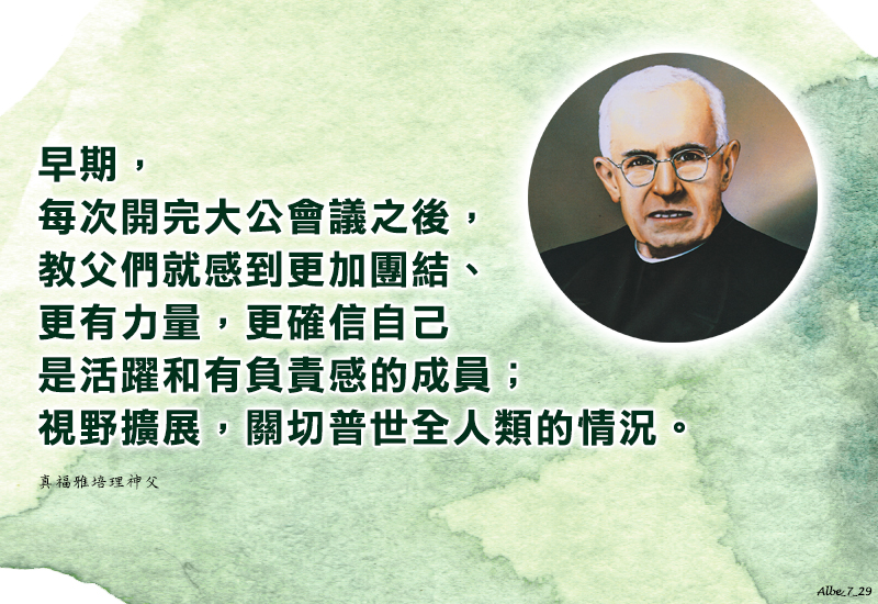 早期,每次開完大公會議之後,教父們就感到更加團結、更有力量,更確信自己是活躍和有負責感的成員;視野擴展,關切普世全人類的情況。 After the Council, the Fathers felt more united and stronger, more persuaded to be alive, active, responsible members; the horizon widened over all humanity (CISP, p. 338).