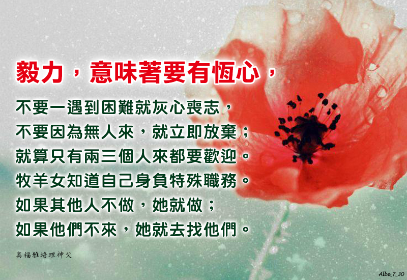 毅力,意味著要有恆心,不要一遇到困難就灰心喪志,不要因為無人來,就立即放棄;就算只有兩三個人來都要歡迎。牧羊女知道自己身負特殊職務。如果其他人不做,她就做;如果他們不來,她就去找他們。 Fortitude. It means constancy, not to be discouraged at the first difficulties and not to stop immediately because people don’t come; welcome even two or three ... The shepherdess knows she has a special office. If the others don’t do, she does; if they do not come, go to look for them (PrP VII, […]