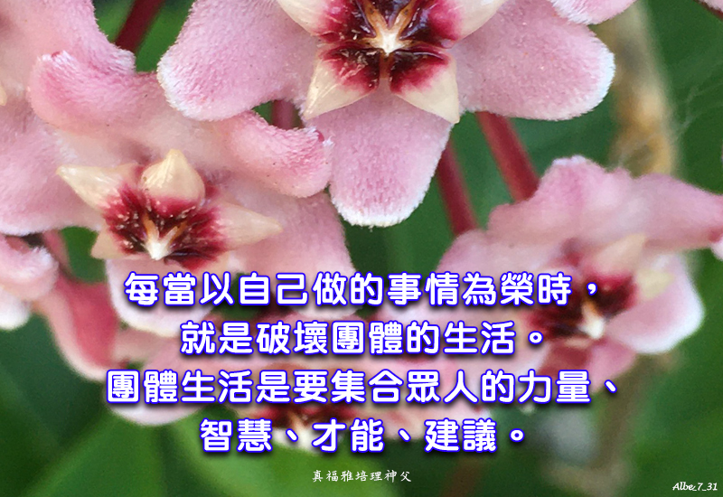 每當以自己做的事情為榮時,就是破壞團體的生活。團體生活是要集合眾人的力量、智慧、才能、建議。 When there is pride to do it oneself, then it is a way doing that cancels common life. Common life is to put together resources, intelligence, ability, advice (FSP59, p. 216).
